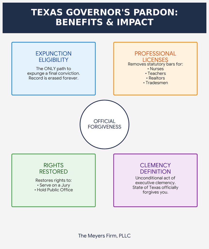 - Expunction Eligibility: This acts as the game-changer. A Texas Governor’s Pardon provides the only way to get a final conviction expunged (destroyed) in Texas./practice-areas/expunctions-non-disclosures/