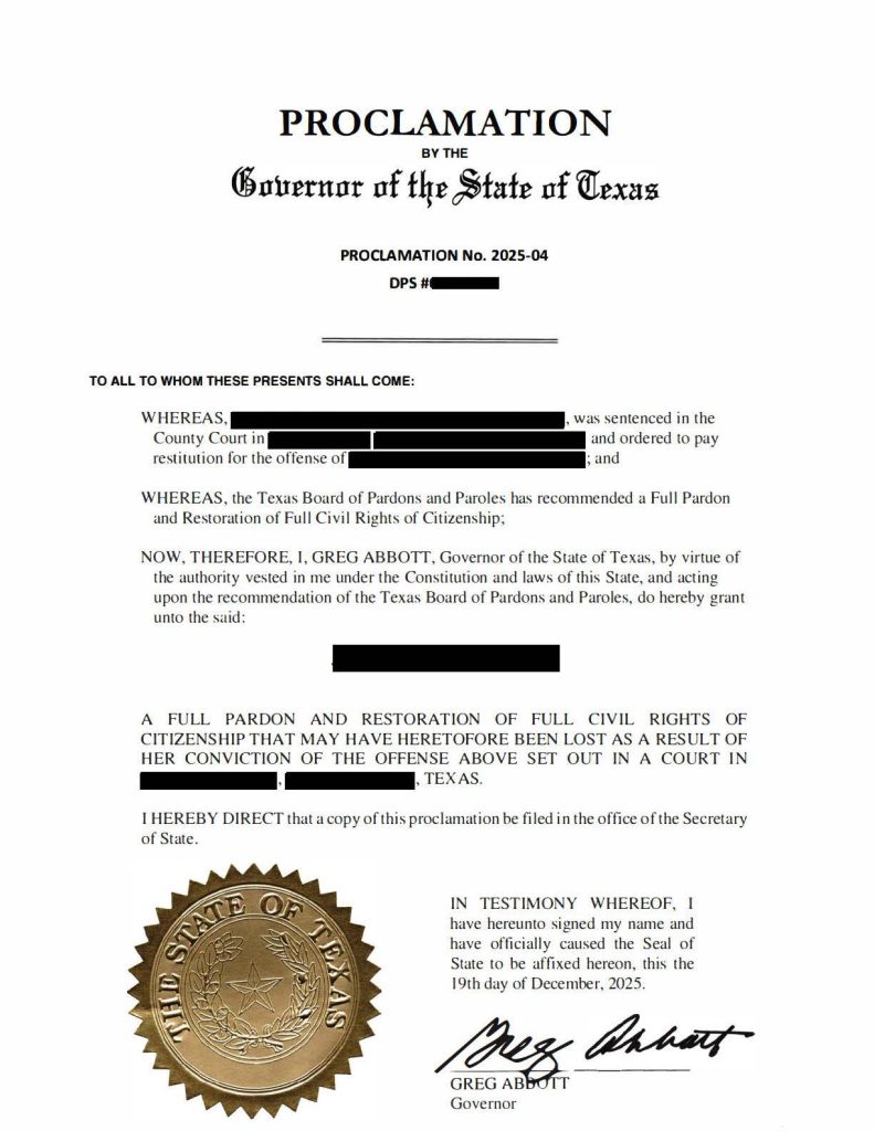 The Result: A Texas Governor’s Pardon and Restoration of Full Civil Rights of Citizenship.